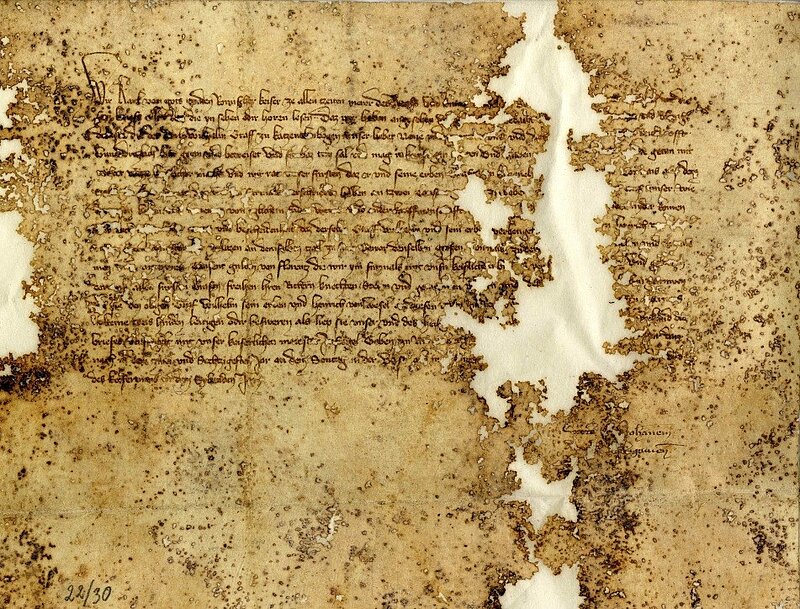 Mitunter sind die originalen Überlieferungen vom Zahn der Zeit buchstäblich enorm benagt worden, wie diese stark beschädigte Urkunde Kaiser Karls IV. von 1362 für die Grafen von Katzenelnbogen zeigt. Von solcherart Stücken einen verlässlichen Text herzustellen, ist aus kulturhistorischen Gründen eine vordringliche Aufgabe angesichts eines im Grunde unaufhaltbaren Verfalls historischer Quellen.