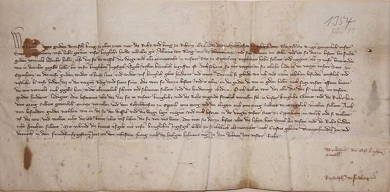 Die meisten der für die jüngsten Constitutiones-Bände relevanten Urkunden stellen relativ schmucklose Schriftstücke auf Pergament dar, wie die hier gezeigte aus dem Jahr 1354: Karl IV., noch als König, befielt der Stadt Oppenheim, den Inhaber der Münz- und Waagerechte, der selbst durch königliche Privilegien begünstigt worden ist, nicht zu behindern. Die durch kleinere Löcher leicht beschädigte Urkunde war bis zum Zeitpunkt der Aufnahme in die MGH-Constitutiones 1978 ungedruckt.
