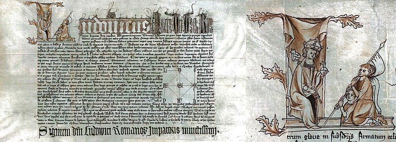 Völlig singulär im Erscheinungsbild der mittelalterlichen Kaiserurkunden überhaupt sind die in einigen Prunkurkunden Kaiser Ludwigs IV. aufwendig gestalteten Initialen des Kaisernamens. Vier dieser von spezialisierten Miniaturmalern geschaffenen L-förmigen Bildnisse ragen besonders hervor, weil sie die in den Urkunden behandelten Rechtsgeschäfte gleichsam visuell übersetzen. In der hier gezeigten Ludowicus-Initiale einer Urkunde von 1338, deren Text im 2013 erschienenen Constitutiones-Band ediert wurde, werden die Herzöge Otto I. und Barnim III. vom Kaiser mit ihrem Herzogtum Pommern[-Stettin] aus dem bis dahin bestehenden Lehensverband der Markgrafschaft Brandenburg gelöst. Die von beiden Herzögen gehaltene Lehensfahne zeigt auch dem leseunkundigen Betrachter, dass es sich um eine Belehnung handeln muss.