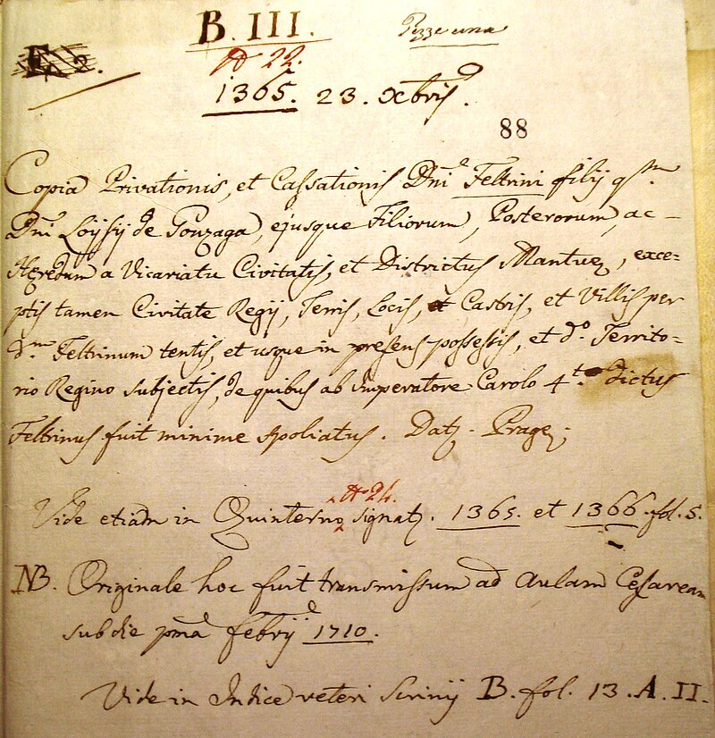 Überlieferung des Originals von 1365 Dezember 23: Haus-, Hof- und Staatsarchiv Wien „AUR 1365 Dez. 23“; Überlieferung der Notiz: Archivio di Stato in Mantua „AG-B-III-busta 2 vicariato imperiale Nr. 22, fol. 88“ (Ausschnitt). Druck: MGH Constitutiones XIV,2 S. 692 Nr. 659. (OBR)