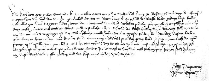 Eine Fülle von Urkunden der Kaiser Ludwig IV. und Karl IV. haben die Vergabe und Empfangsbestätigung jener Steuer zum Inhalt, die die keinem Fürsten, sondern nur direkt dem Kaiser unterstehenden, also reichsunmittelbaren Reichsstädte jährlich dem Reichsoberhaupt schuldeten. Diese Abgabe, ein Beleg auf dem komplizierten Weg zum modernen Steuerwesen, wurde vom Kaiser zu festgesetzten Terminen eingefordert. Lübeck etwa hatte zu Maria Geburt, also am 8. September, zu zahlen, die meisten anderen Reichsstädte zu Martini, also dem 11. November. Die Höhe war nicht bei allen Reichsstädten gleich und richtete sich nach alter Gewohnheit oder der tatsächlichen, mitunter aber auch nur vermuteten Wirtschaftskraft der Kommune. Weißenburg im Elsass zum Beispiel musste vierhundert Gulden zahlen, das reiche Florenz hingegen viertausend, das Zehnfache also (s. auch Fundstück 1). In Schwaben und Franken wurde meist in Hellern gerechnet: Esslingen oder Rothenburg zahlten 800 Pfund Heller, Rottweil 400 Pfund, was ungefähr 500, respektive 250 Gulden entsprach. Die Zahlungspflicht bestand de jure bis zum Ende des Alten Reiches und zog bei einigen Reichsstädten noch im 17. Jahrhundert, wie im Falle Reutlingens, oder sogar bis ins 18. Jahrhundert, wie bei Esslingen, eine Fülle von Prozessen nach sich, um zu klären, wann wieviel an wen zu zahlen sei. Nur selten kam aber ein kaiserlicher Bote in den Städten vorbei, um die Gelder einzusammeln. Die Regel war eher, dass die Bürgerschaften konkrete Anweisung erhielten, diesem oder jenem genannten Empfänger das Geld zuzustellen. Oft hatte der Kaiser, der eigentlich immer in Geldnot war, diese Einnahmen schon vor dem Fälligkeitstermin vergeben, mitunter sogar schon mehrere Jahre im Voraus. Das konnte dann zu Irritationen und offenem Streit führen, besonders, wenn Anteile mehrmals verliehen worden waren. So hatte Karl IV. zweimal bei Lübeck einfach „vergessen“, wie er schreiben ließ, dass er schon anderen Empfängern das Geld übertragen hatte. Es empfahl sich also von Seiten der Kommunen bei der Auszahlung eine gewisse Zögerlichkeit vorwalten zu lassen, was nun wiederum Mahnungsschreiben des Kaisers nach sich zog, in denen er bei Nichtbeachtung mit Huldverlust drohte. So verhielt es sich auch am 17. Januar 1363, als Karl der Stadt Rothenburg ob der Tauber befahl, die unlängst, nämlich schon am 11. November 1362 fällig gewordene jährliche Reichssteuer der Stadt nun „unverczogenlich“, also unverzüglich, den Landgrafen Ulrich II. und Johann I. von Leuchtenberg auszuhändigen. Da aber die Rothenburger über viele Jahre ihre Steuergelder den Burggrafen von Nürnberg zugestellt hatten, wollte man wohl lieber abwarten, ob das mit den Landgrafen seine Richtigkeit hatte. Denn wenn Zahlungen an den falschen Empfänger gingen, war das Geld verloren und musste noch einmal aufgebracht werden. Sollten die Rothenburger endlich das Geld übergeben haben, lässt Karl dann noch schreiben, würde der Kaiser für das vergangene Jahr die Steuerzahlung quittieren. Am Ende des Schriftstücks ist rechts auf der umgebogenen Unterseite ein Kanzleivermerk erkennbar, der den Beurkundungsbefehl dokumentiert: „P(er) d(omi)n(u)m imp(er)atorem / Joh(a)n(n)es Eysteten(sis) – Durch den Herrn Kaiser / Johannes von Eichstätt“.