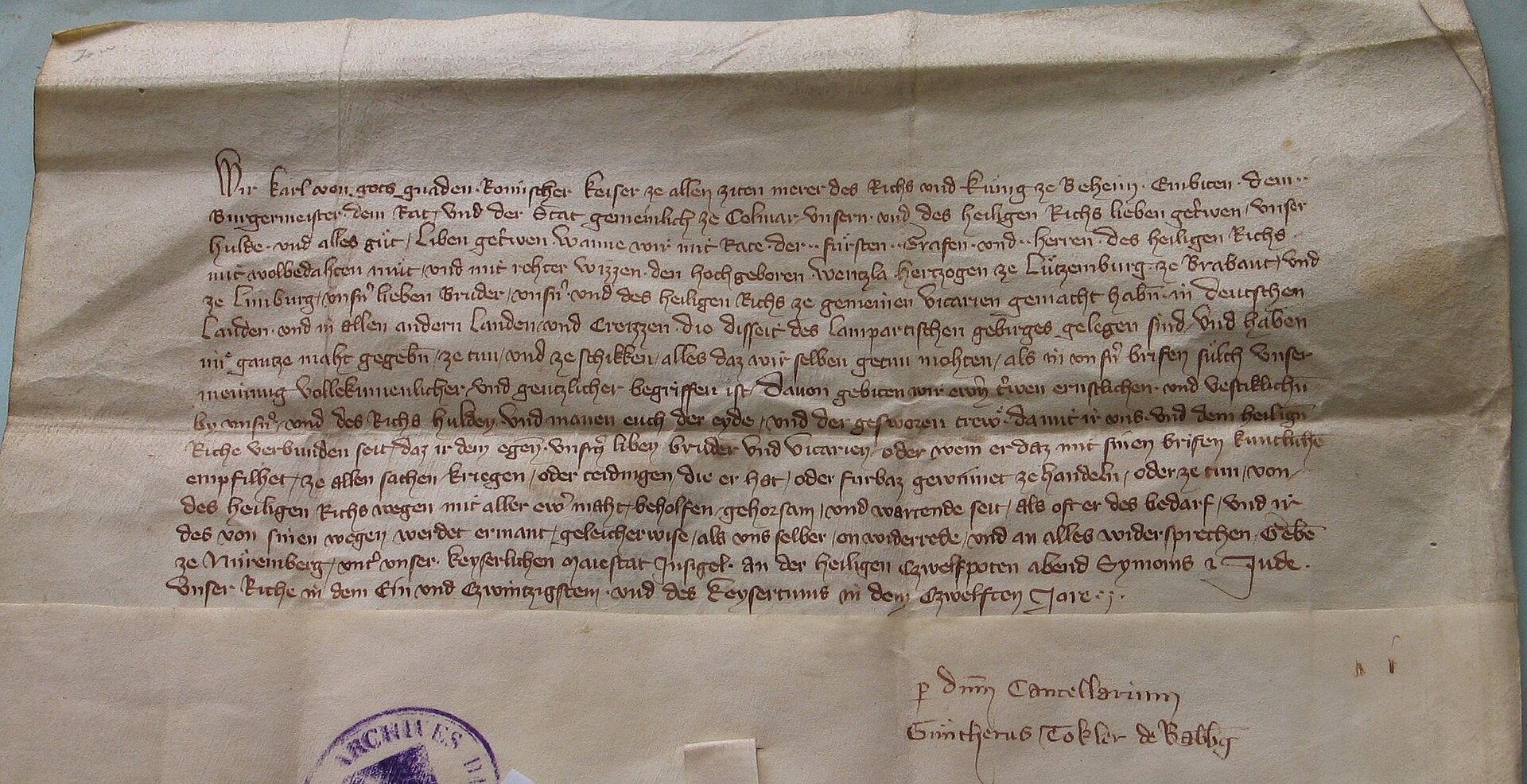 Wir Karl von gots gnaden Romischer keiser ze allen ziten merer des richs und kunig ze Beheim embiten dem burgermeister, dem rat und der stat gemeynlich ze Colmar, unsern und des heiligen richs lieben getrewen, unser hulde und alles gut. Liben getrewen: Wanne wir mit rate der fursten, grafen und herren des heiligen richs mit wolbedahtem mµt und mit rehter wizzen den hochgeboren Wenczla, herczogen ze Lutzemburg, ze Brabant und ze Limburg, unserm lieben bruder, unsern und des heiligen richs ze gemeinen vicarien gemacht haben in Deutschen landen und in allen andern landen und creizzen, die disseit des Lampartischen gebirges gelegen sind, und haben ime gancze maht gegeben ze tun und ze schikken, alles daz wir selber getun mohten, als in unsern brifen sulch unser meinung vollekumenlicher und genczlicher begriffen ist. Davon gebiten wir ewern trewen ernstlichen und vestiklichen by unsern und des richs hulden und manen euch der eyde und der gesworen trewe, da mit ir uns und dem heiligen riche verbunden seit, daz ir dem egen(anten) unserm liben bruder und vicarien, oder wem er daz mit sinen brifen kuntlichen empfilhet, ze allen sachen, kriegen oder teidingen die er hat oder furbaz gewinnet zu handel oder ze tun von des heiligen richs wegen mit aller ewer maht, beholfen, gehorsam und wartende als oft er des bedarf und ir des von sinen wegen werdet ermant geleicherwise, als uns selber on widerrese und an alles widersprechen.
