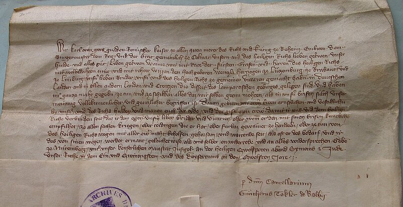 Geben ze Nuremberg unter unser keyserlichen maiestat insigel an der heiligen czwelfpoten abend Symonis und Jude, unser riche in dem ein und czwinczigstem und des keysertums in dem czwelften jare.