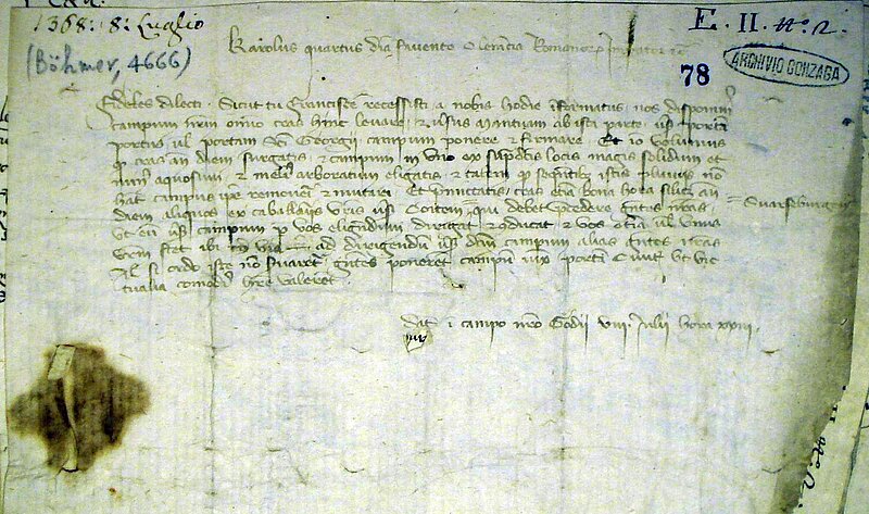 Karolus quartus divina favente clemencia Romanorum imperator et c(etera). Fideles dilecti: Sicut tu Francisce recessisti a nobis hodie informatus nos disponimus campum nostrum omnio cras hinc levare et versus Mantuam ab ista parte versus portam portus vel portam sancti Georgii campum ponere et firmare. Et ideo volumus, quod cras ante diem surgatis et campum in uno ex supradictas locis magis solidum et minus aquosum et melius arboratum eligatis et talem, quod sequentibus istis pluviis non habeat campus ipse removeri et mutari. Et premittatis cras etiam bona hora silicet ante diem aliquos ex caballeriis vestris versus comitem Svarseburgen(sem) , qui debet precedere gentes nostras, ut cum versus campum per vos eligendum dirigat et conducat et vos etiam vel unus vestrum stet ibi in via ad dirigendum versus dictum campum alias gentes nostras vel, si ordo iste non servaretur, gentes ponerent campum iuxta portam civitatis, ut victualia comodius habere valerent.