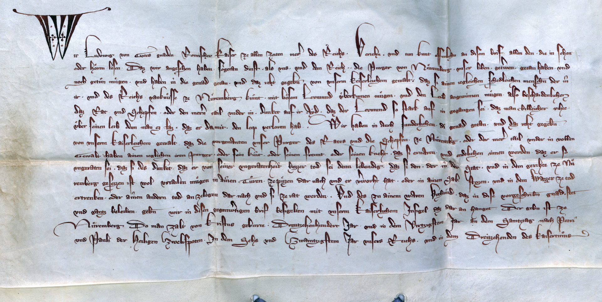 Wir Ludowig von gotes gnaden Romischer kaiser, ze allen zeiten merer des reichs, veriehn und tun kunt offenlichn an disem brif allen den, die in sehen oder horen lesen, daz wir angesehen haben sogetan dinst, als uns und dem reich die purger von Nuremberg, unser liben getriwen, getan haben und noch getun mugen, und haben in die genad getan und daz reht gegeben von unserm keiserleichem gewalt, daz si ainen iegleichen schedleichen menschen, der in ir und des reichs vanknusse ze Nuremberg kumt, mit bosem leumund uberkumen mugen und den leib angewinnen mugen also beschaidenlichen, daz rat und schepfen oder den merern tail under in dunket auf ir ayd, daz der leumund so stark auf in gegangen sei, daz man billeicher rihte uber seinen leib denn man ez laz, daz er damit den leip verloren hab. Wir haben in auch sunderlichen di genad getan und daz reht gegeben von unserm kaiserleichem gewalt, daz die vorgenanten unser purger des rates und die schepfen ze Nuremberg oder der merer tail under in vollen gewalt haben, ainen ieglichen iren purger oder sein kint oder seinen freunt oder seinen kneht, daz si ervaren und endelichen innen werden, daz er so ungeraten sei, daz si des dunket, daz er von seiner ungeratenheit bezzer tod sei denn lebendig, daz si den, der in der stat und in dem gerihte ze Nuremberg gesezzen ist, wol urtailen mugen in ainen turen ze puzen, dar nach und er verworht hat, oder in ainen sak stozen und in dem wazzer ze tod ertrenken oder ainen andern tod anzelegen, dar nach und si ze rat werden. Und des zu ainem waren urchund, daz in dise vorgeschriben gnad stet und gancz beleiben, geben wir in disen gegenwertigen brif, besigelten mit unserm kaiserlichem insigel, daz dar an hanget.